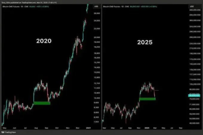 In the left panel, the chart tracks the 2020 futures pattern, with price compressing above a highlighted green band before breaking higher toward record levels. In the right panel, the 2025 futures curve traces a similar consolidation above another green zone, this time just below the $90,000 area. The comparison suggests that Bitcoin again sits on a thick support block that could, if it holds, act as a launchpad for a fresh leg up.