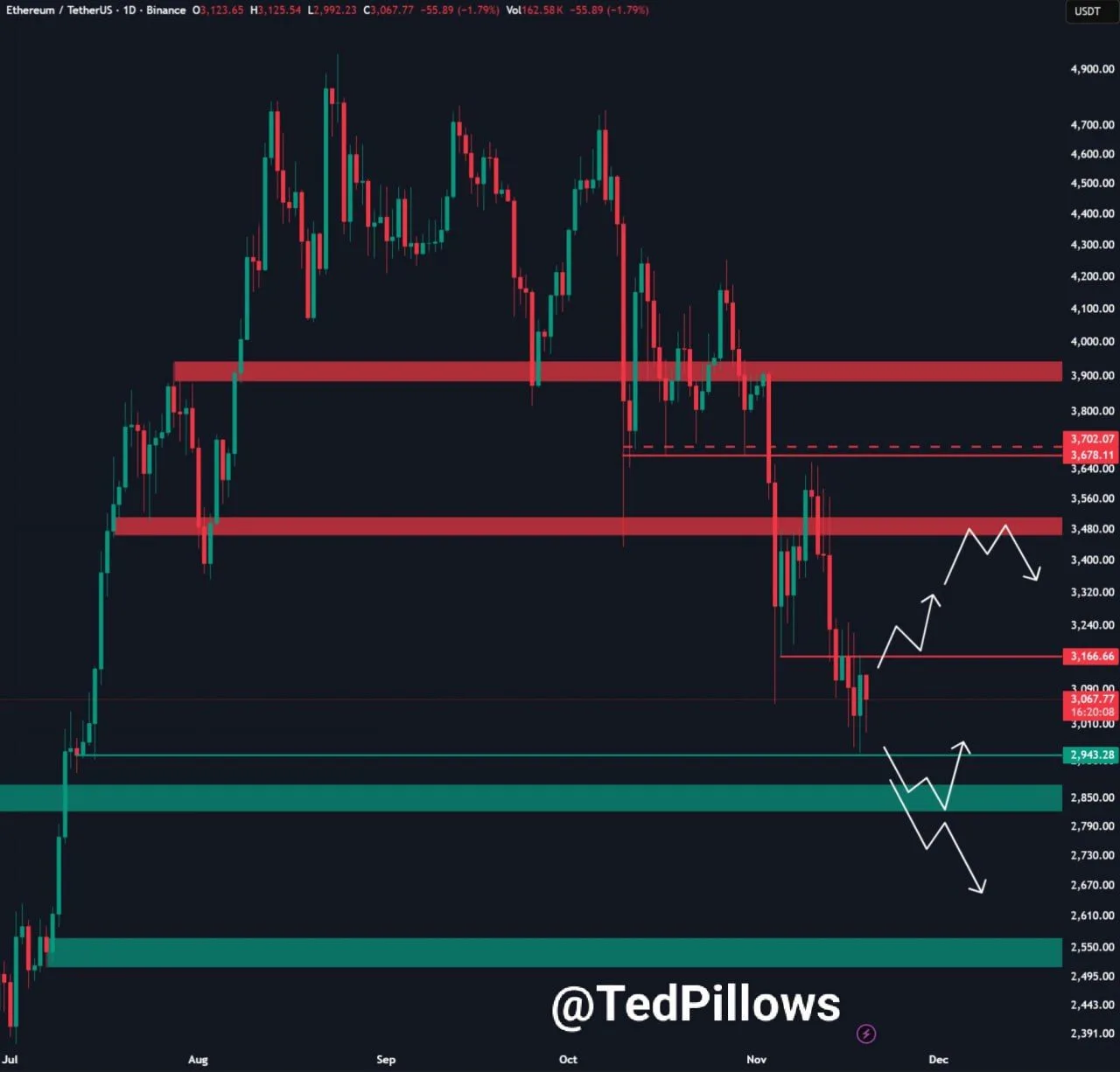 Meanwhile, Ethereum is sliding below the $3,000 mark again, keeping the chart tilted toward downside risk. The daily setup from trader TedPillows shows price trading under a former support band that ran around $3,200, turning that zone into the first major barrier for any recovery attempt.