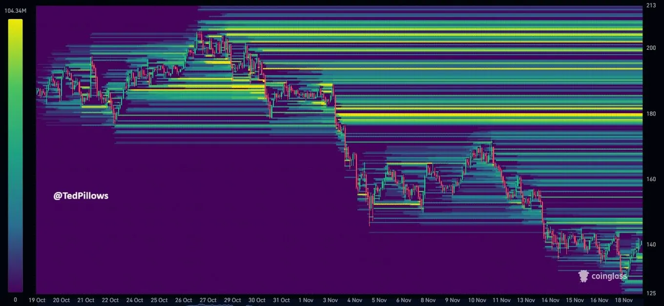 Moreover, liquidity maps show strong upside clusters between $170 and $200. These zones could attract price if market sentiment improves. SOL currently stabilizes near $135 to $145, where small liquidity pockets appear.