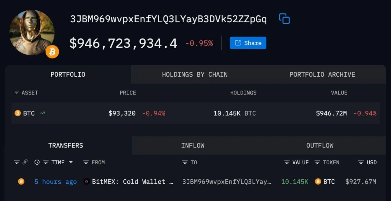 Meanwhile, on-chain data show a whale address has received 10,145 BTC, valued near $1 billion at recent prices. A portfolio view for address 3JBM969wvpxEnfYLQ3LYayB3DVk52ZZpGq records a single inflow of 10.145K BTC from a BitMEX cold wallet roughly five hours ago, placing the full stack under that wallet’s control.