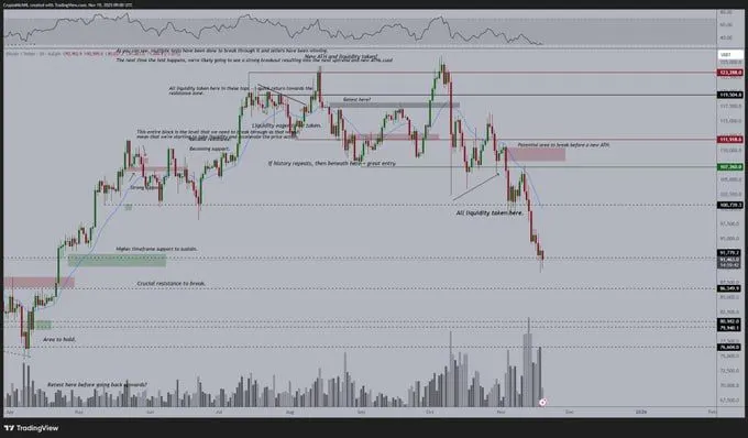 At the same time, he cautioned that reversals rarely happen quickly. Poppe expects Bitcoin to move sideways for a period as the market builds a new base following the sharp decline. The chart shows liquidity already cleared below recent lows, leaving room for consolidation before any sustained upward move can begin.