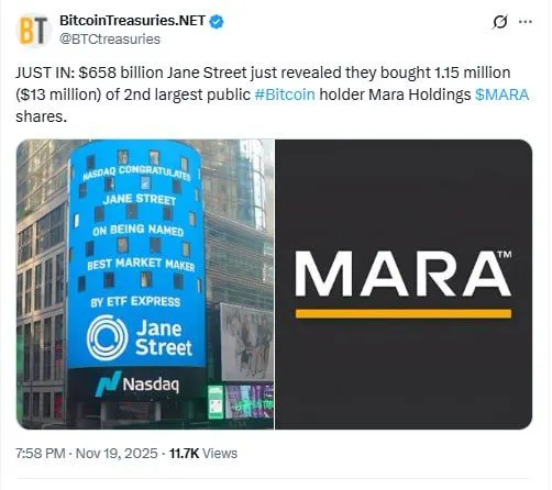Jane Street has revealed a fresh position in Marathon Digital, adding another major Wall Street name to the list of institutions gaining exposure to Bitcoin through mining equities. The disclosure, filed on Nov. 19, shows the trading giant purchased about 1.15 million MARA shares, valued at roughly $13 million.
