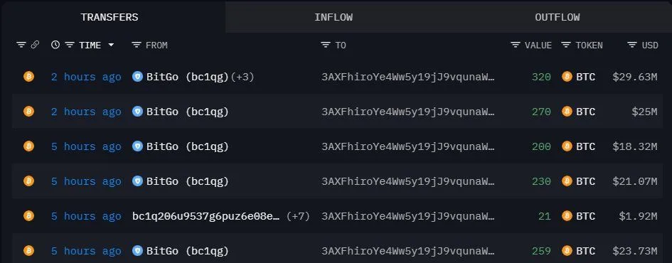 A series of large transfers shows a single buyer accumulating more than $120 million in Bitcoin, even as retail traders pull back during the latest bout of market uncertainty. The transactions appeared within a few hours on Arkham, where several inflows moved from BitGo-linked addresses into one receiving wallet.