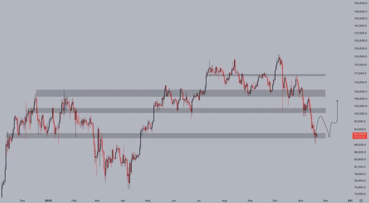 However, the setup still depends on time and confirmation. Jelle notes that bulls need to keep price above support “until after the weekend” for the pattern to play out, underlining that another strong daily close below $90,000 would invalidate the double-bottom idea. In that case, the chart leaves room for a slide toward lower demand areas highlighted earlier in the year, where Bitcoin last consolidated in the $80,000s before its summer breakout.