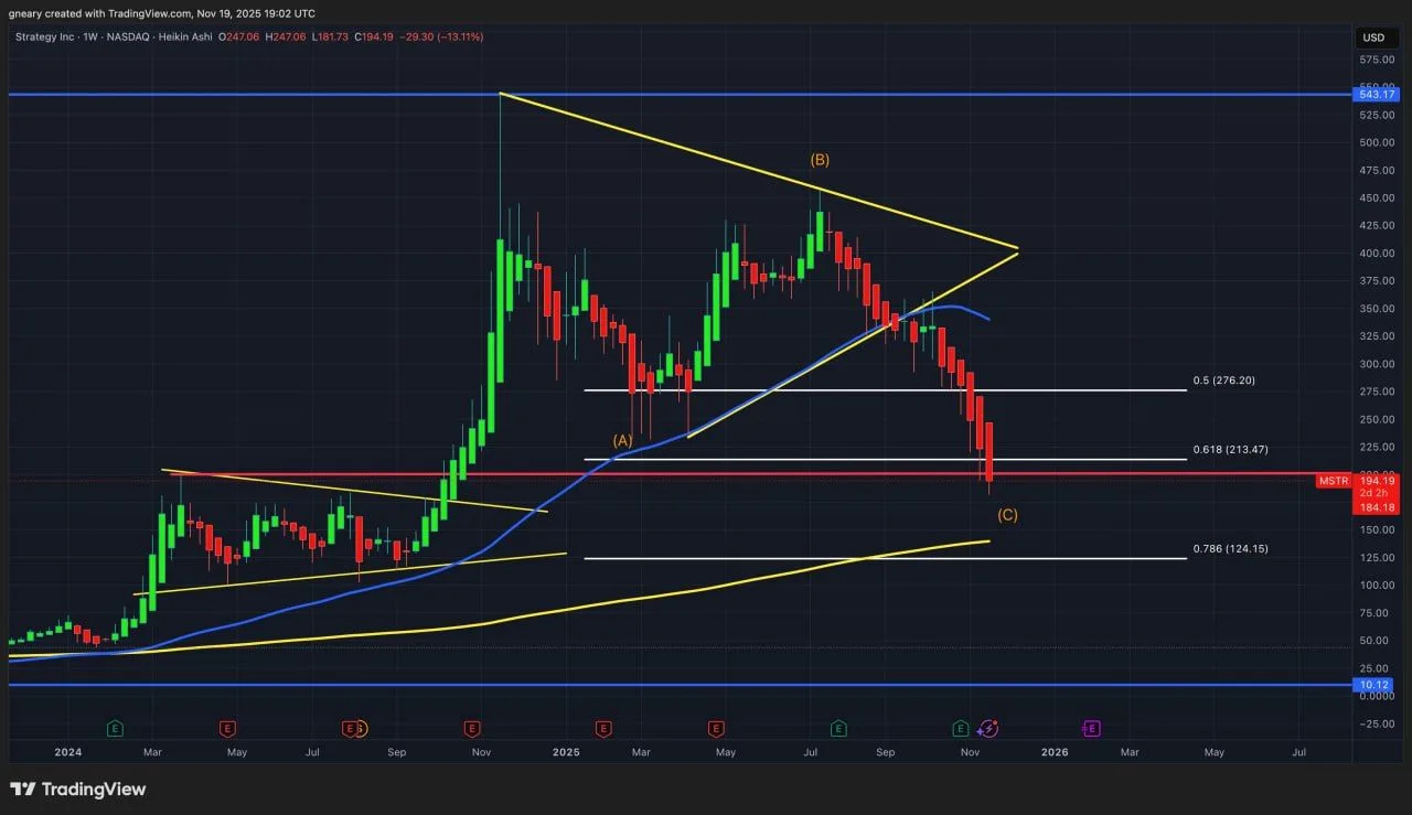 Meanwhile, MicroStrategy’s weekly structure continues to break down, and the latest chart shows price pushing straight through key Fibonacci retracements. The move now places the 200-week moving average near 140 dollars in focus as the next major test.