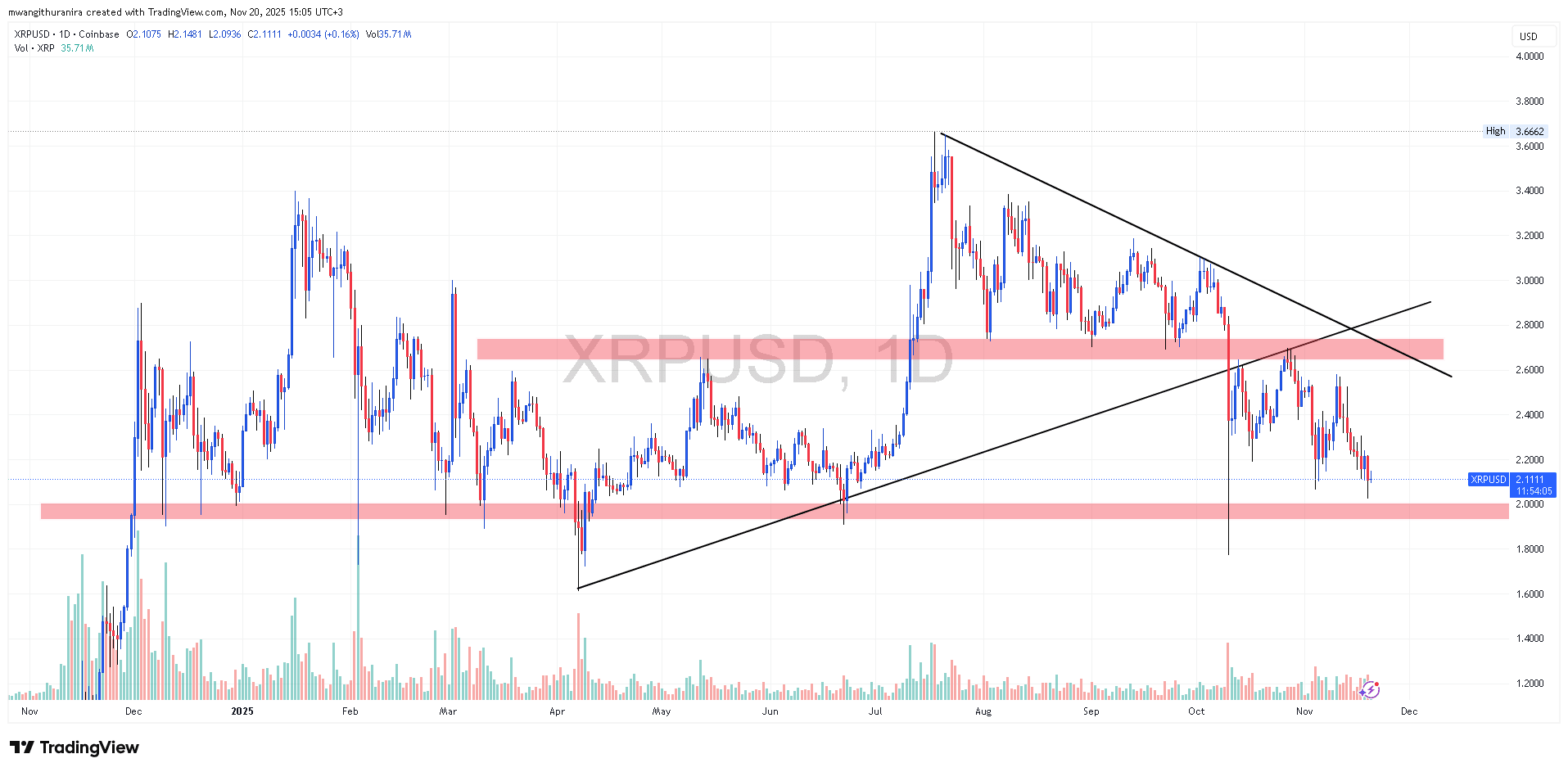 Recent highs at $3.6 marked the upper boundary before XRP turned bearish. The chart shows a break below an ascending trendline, sending price back toward the $2 zone. This is a major level that many traders treat as a cycle-defining line.