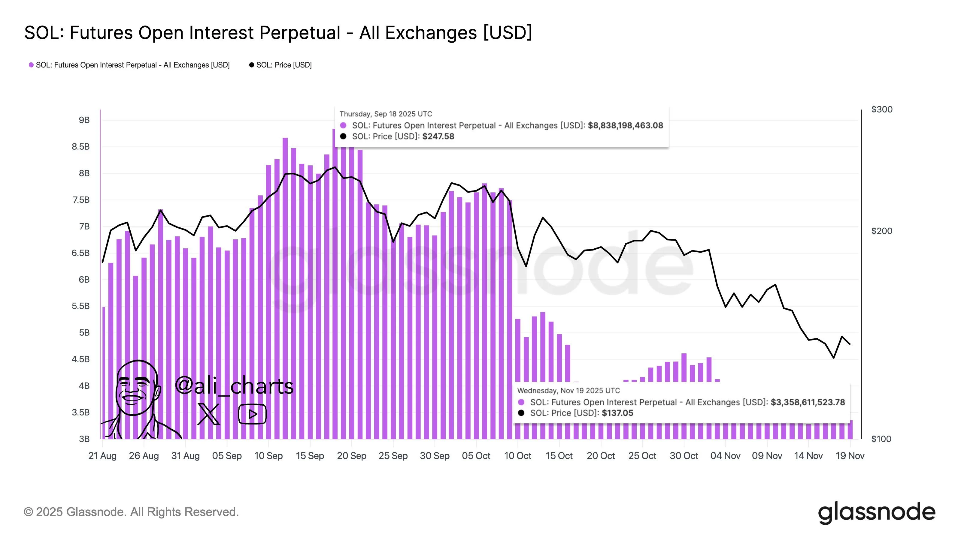 Open interest dropped from $8.84B to $3.36B over three months as stated in X by Ali Charts. That’s huge. But what does it mean?
