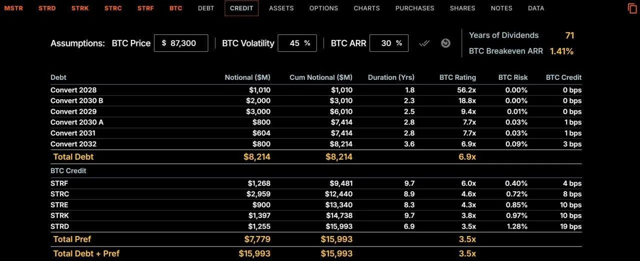 Underneath those assumptions sits a large stack of debt and preferred equity. The credit page shows about 8.2 billion dollars of total debt and 7.8 billion dollars of preferreds, for roughly 16 billion dollars in combined obligations. Yet the dashboard gives the capital structure a Bitcoin “credit rating” multiple of 3.5 times, suggesting that, in Strategy’s view, the current BTC position more than covers those liabilities over time.