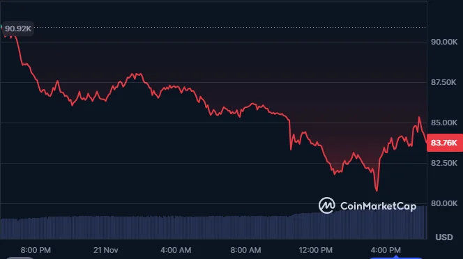 Bitcoin traded around $83,760 at the time of writing, after fluctuating between approximately $81,000 and $87,000 over the previous 24 hours. The cryptocurrency has fallen more than 30% from its peak above $120,000 reached in October.