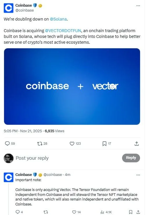 Coinbase Acquires Vector on Solana. Source: Coinbase on X