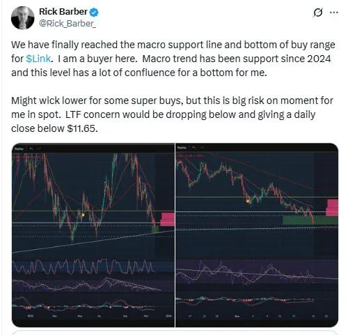 Meanwhile, Rick Barber says Chainlink has dropped into what he views as the macro support line and bottom of his buy range. In his post, he notes that this level has acted as support since 2024 and that several indicators now cluster around the same area, giving him confluence for a potential bottom. He adds that, for his spot position, the key risk would be a daily close below roughly $11.65.