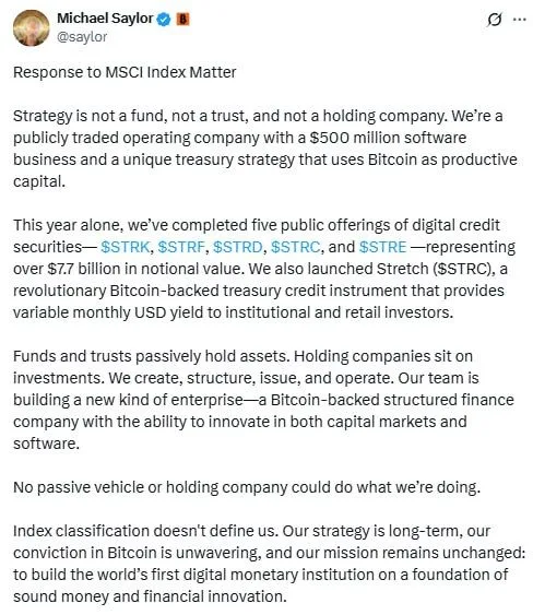 Strategy MSCI Index Response. Source: Michael Saylor on X