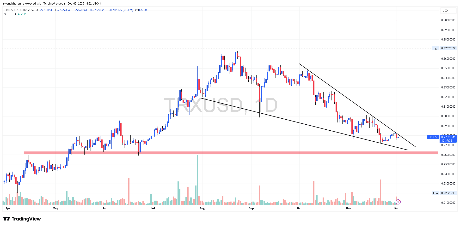 TRX trades at $0.2773 after a 6.16% monthly fall and a modest 1.98% weekly gain. That monthly slump reflects broader market pressure. Yet price now sits near a critical area defined by a falling triangle formation. This pattern compresses price action under a downward trendline, forcing bulls and bears into a tighter decision zone.