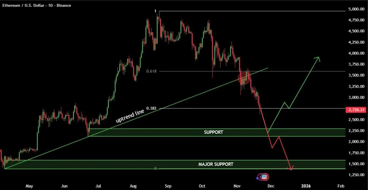 Ethereum has slipped into a key danger zone after losing its main daily uptrend line and the 0.618 Fibonacci retracement level, according to analyst DrBullZeus. The break signals a structural shift in the chart, with bears tightening their grip as price trades near the mid-2700 range.