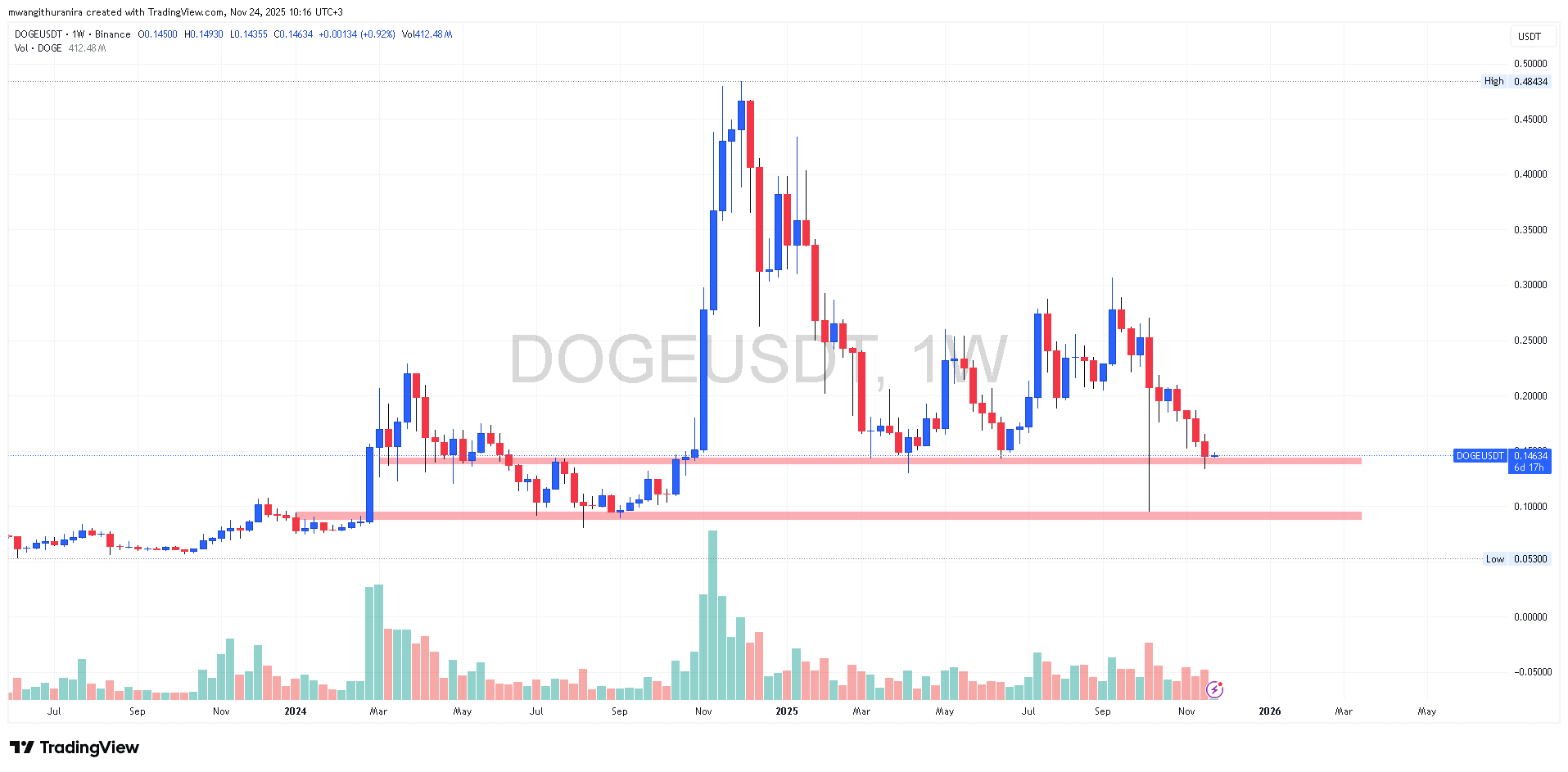 DOGE trades around $0.1466, holding a mid-range position. The structure shows consolidation and weakness, with room for a dip toward $0.09270, a strong historical support area. Many watch that zone closely, if the current one breaks, since it marks a key reaction area.