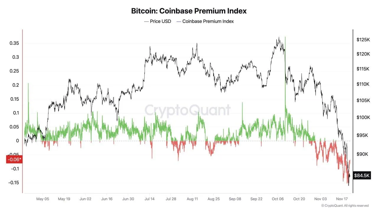 The chart shows Bitcoin moving toward the mid-80,000 dollar zone while the hourly premium stays below zero. This negative reading means BTC is trading cheaper on Coinbase than on offshore venues, which usually indicates selling pressure or weaker bid activity from U.S. participants. At the same time, the green and red bands in the data highlight how consistently the index has remained below neutral since early November.