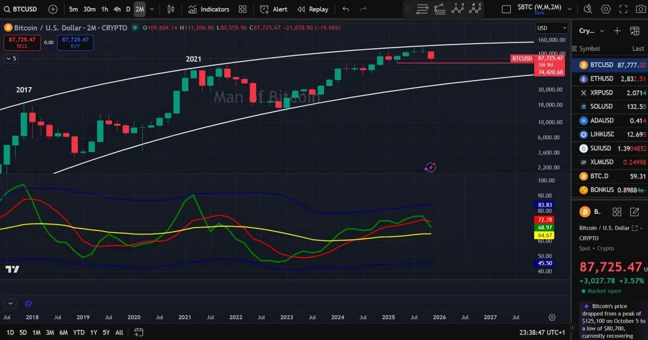 Meanwhile, Bitcoin’s two-month Traders Dynamic Index now flashes a classic late-cycle warning as the green line crosses below the red line. On Man of Bitcoin’s chart, the slow moving average (green) has slipped under the fast moving average (red) while BTC trades near the upper boundary of a long-term rising channel that connects the 2017 and 2021 tops.