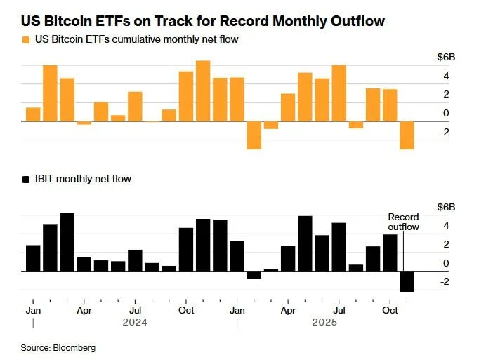 Bitcoin spot ETFs are heading toward their worst monthly outflow on record as investors pull billions from the products, signaling a sharp reversal from the enthusiasm that fueled early-year gains. According to Bloomberg data, about 3.5 billion dollars has exited U.S. Bitcoin ETFs in November, nearly matching February’s previous record. BlackRock’s IBIT has seen about 2.2 billion dollars in redemptions, placing it on track for its weakest month since launch. The charts show cumulative ETF net flow sinking into negative territory while IBIT’s monthly bar drops below zero at a record pace.