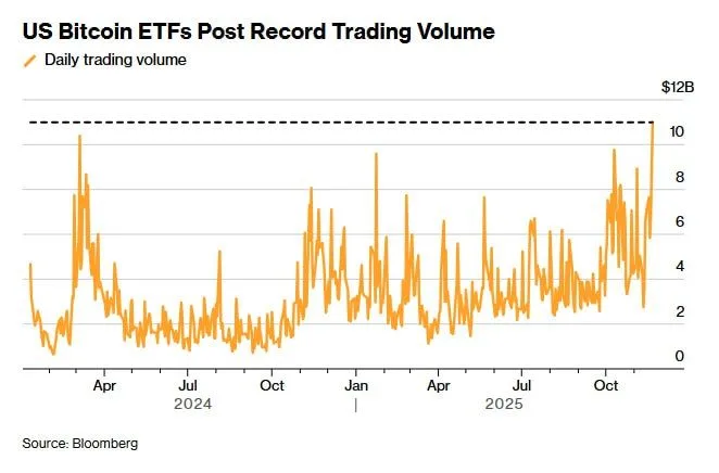 At the same time, Bitcoin is navigating its harshest month in years. After sliding to 80,553 dollars on Friday, the token rebounded toward 87,000 dollars early Monday. Even so, it remains down roughly seven percent for the year, marking a sharp turn from the highs reached during the inflow-driven rally in early 2024. Bloomberg’s trading-volume chart shows ETF activity surging to a record 11.5 billion dollars on Friday, with IBIT handling about 8 billion dollars on its own. The spike highlights how aggressively investors are repositioning as sentiment shifts.