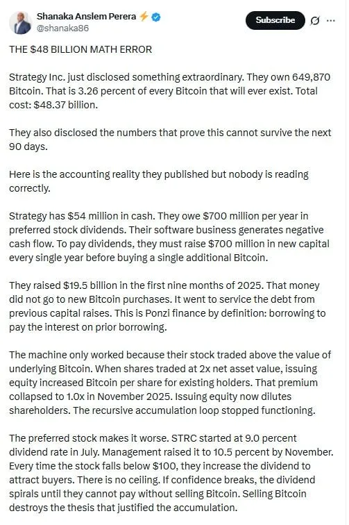 However, critics argue Shanaka Anslem Perera’s thread misreads Strategy Inc.’s numbers and overstates any 90 day risk. They say SEC filings show a Bitcoin cost basis near 15 billion dollars, not 48 billion, because his figure triple counts capital raised via equity, converts and preferreds. They also note only about 105 million dollars a year is a hard cash preferred obligation, while other preferred classes are cumulative, stock payable or discretionary, so the 700 million dollar “mandatory cash” claim is inaccurate.
