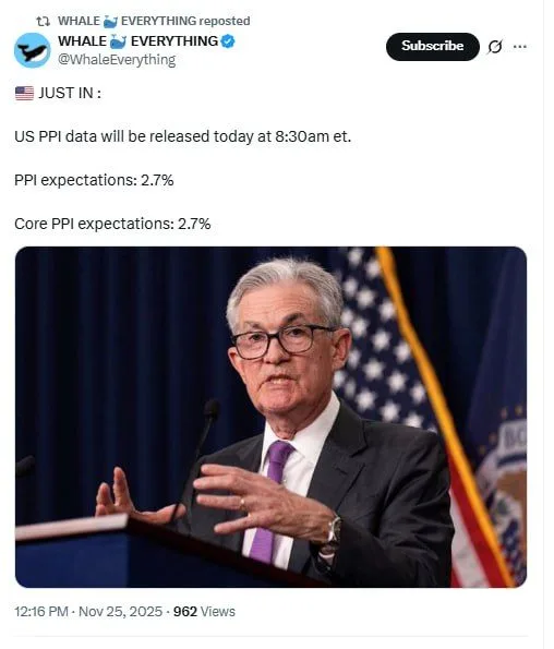 Markets are bracing for the November 25 U.S. PPI print, and the timing aligns with visible stress in Bitcoin order books. New liquidity data shows heavy sell-side supply sitting between 80,000 and 90,000 dollars, while whale cohorts continue to reduce their bid support.Together, the macro backdrop and the declining liquidity create a fragile setup for crypto.