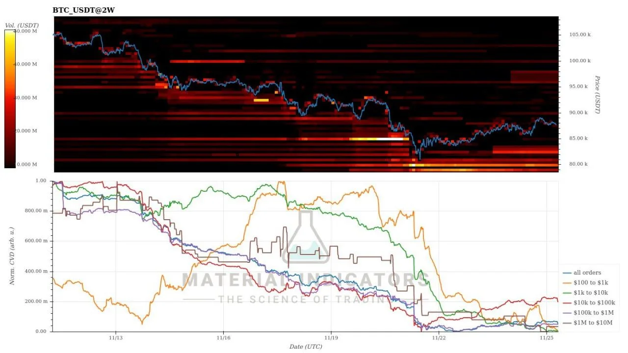 The CVD panel shows how different buyer classes behaved from November 13 to November 25. The 1 million to 10 million-dollar cohort (orange) sold aggressively throughout the period, with notable declines on November 16, November 19, and November 22. This group typically influences short-term trend direction, so sustained selling adds pressure.