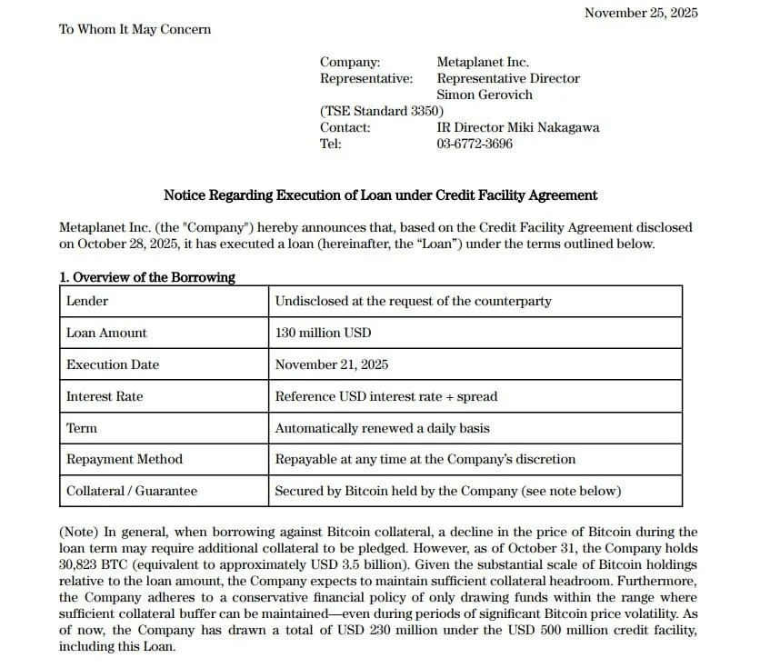 Metaplanet has executed a fresh 130 million dollar loan under its Bitcoin-backed credit facility, expanding its balance-sheet leverage as it deepens its long-term Bitcoin strategy. The new draw appears in the company’s latest disclosure, which confirms that the facility’s total limit remains 500 million dollars, with 230 million dollars now used following this loan and earlier borrowings.