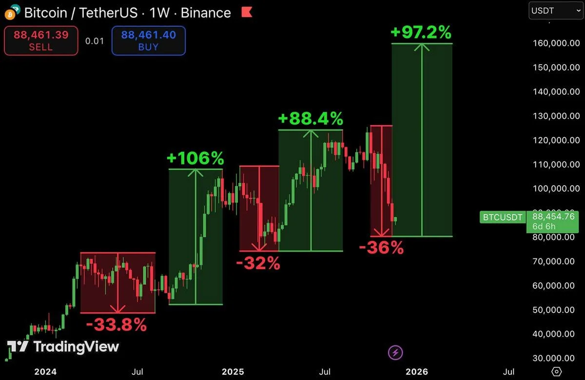 Meanwhile, a crypto trader is calling an 80,000 dollar bottom for Bitcoin and mapping out a fresh leg higher. Pseudonymous analyst Aralez shared a weekly BTC/USDT chart on Binance that marks the recent drawdown near 36 percent and labels the 80,000 dollar area as the cycle low. The visual ties the current move to earlier pullbacks of about 33.8 percent and 32 percent, each followed by sharp rebounds.