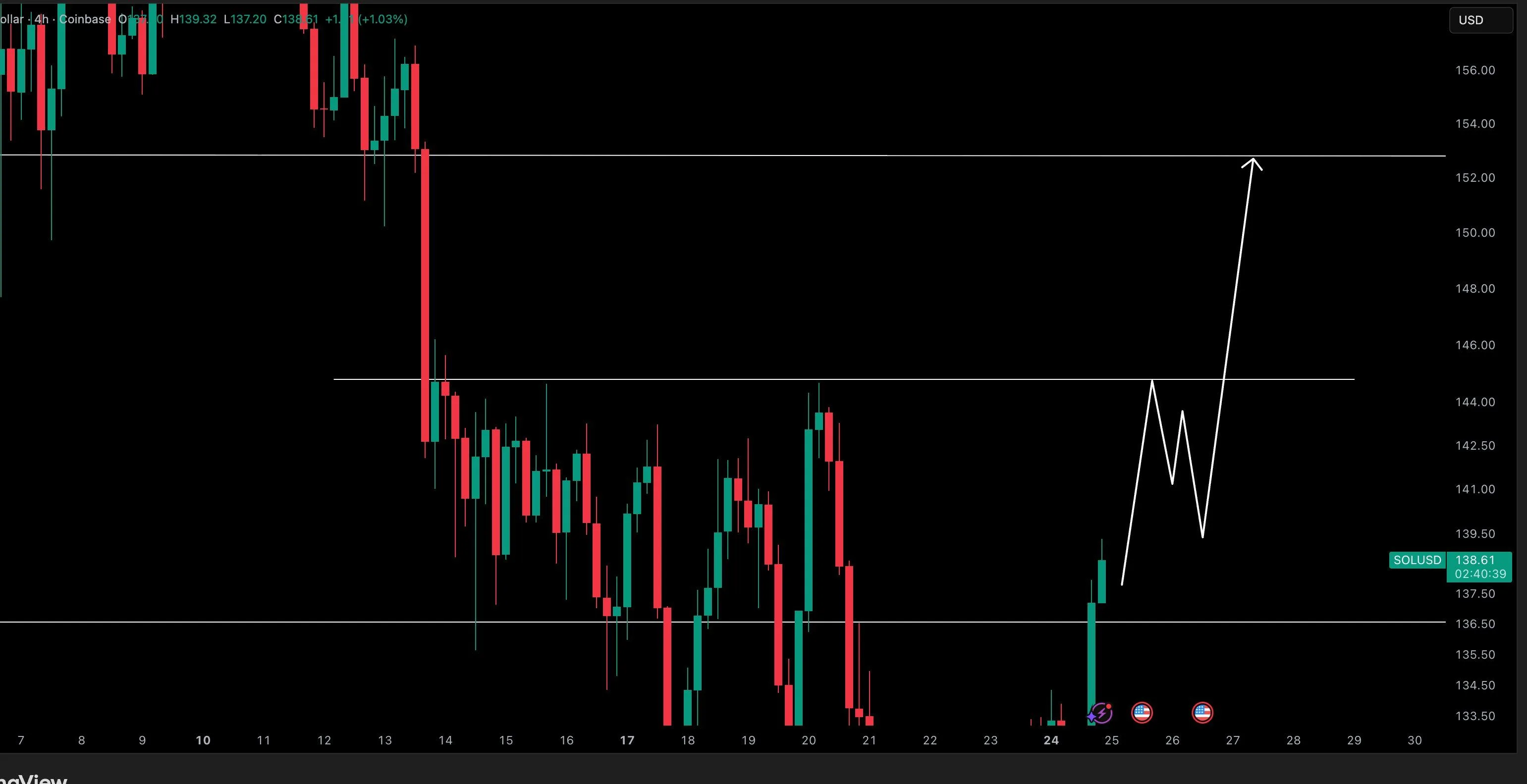 Crypto Tony said buyers reacted strongly at this region and pushed price toward the $142–$144 resistance band. He noted that a break above this zone could open a path toward $152, which remains the next major supply region. However, failure to reclaim $144 keeps Solana inside a consolidation pattern.