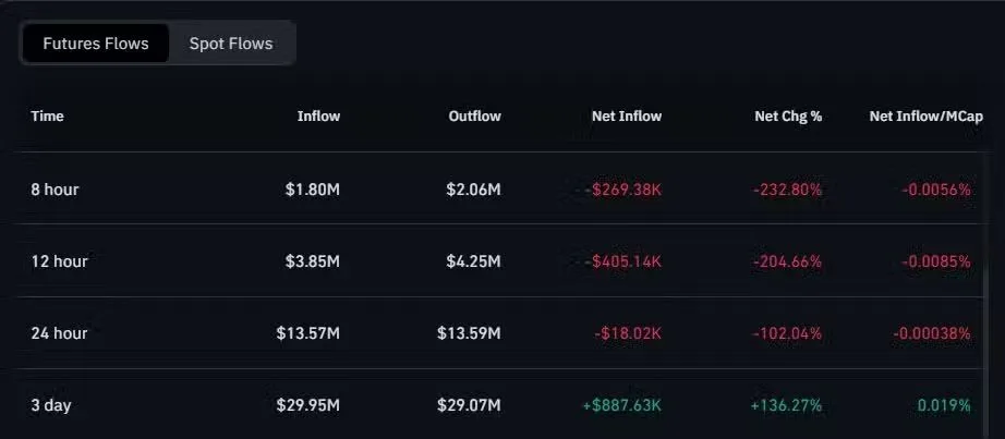 In derivatives markets, futures flow data revealed continued caution. SHIB recorded consistent net outflows across 8-hour, 12-hour, and 24-hour windows. Data showed outflows surpassing inflows by $269.38K, $405.14K, and $18.02K respectively. The readings also included steep net-change percentages, such as –102% over 24 hours and –232% over 8 hours.