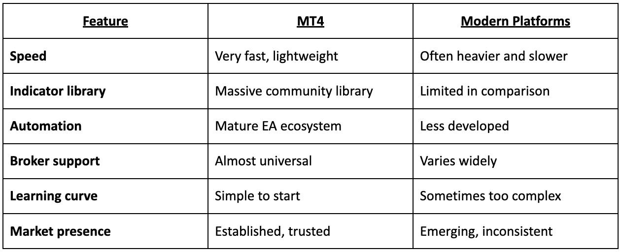 MT4’s strength isn’t that it outperforms every new tool: it’s that it’s stable, predictable and deeply supported.