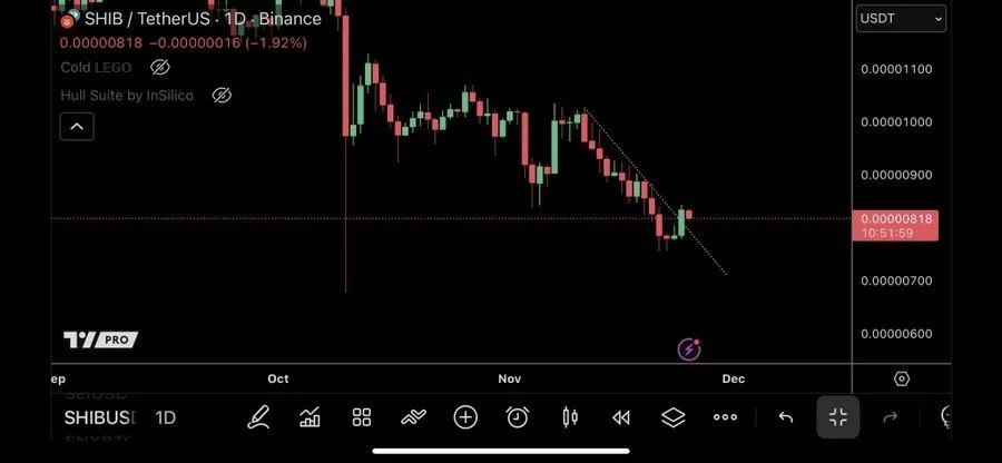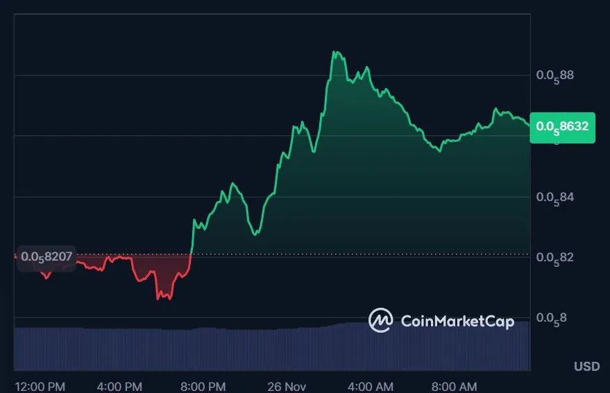 Shiba Inu climbed 4% today to $0.000008632 after falling to $0.00000678 last week. For most of November, SHIB moved inside a steady downward structure, forming lower highs and lower lows. Recent price action shows the token pushing above a descending trendline that held for several weeks. Analysts viewed this move as an early sign that buyers were regaining control after a long period of weakness.