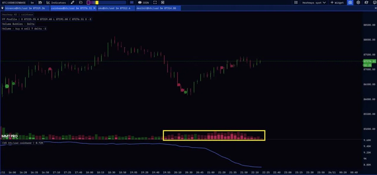 The 5-minute Coinbase BTC/USDC chart displayed a quick run toward 87,900 dollars, followed by repeated rejections. Each rejection printed red candles. Volume bars increased on the sell side during these pullbacks. A highlighted yellow box at the lower section of the chart marked the period of strongest selling volume, showing sustained deposits of sell orders.