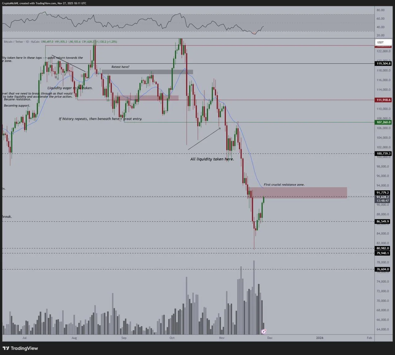Bitcoin is approaching a key resistance zone that could reopen a path to $100,000 if it breaks, according to trader Michaël van de Poppe. His latest BTC/USDT chart shows price pushing into the first “crucial resistance zone” after a sharp rebound from recent lows.