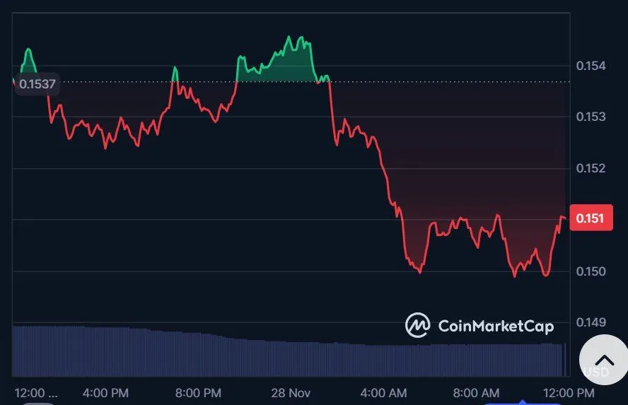Dogecoin is trading around $0.151, down by 0.6%, showing a steady pullback after failing to hold above the $0.153–$0.154 area. This shows a weakening momentum, with sellers keeping pressure as the price forms lower highs.