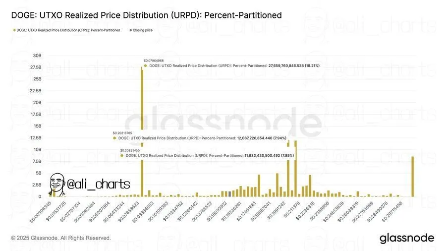 The chart also highlights meaningful resistance zones forming at higher realized price levels, particularly around $0.20 and $0.29, where more than 12 billion DOGE and a sizable secondary cluster were last transacted. These levels suggest that a large segment of investors entered the market during previous rallies, and they may look to reduce exposure once the price revisits these areas. As analyst Ali Martinez often notes, these realized price concentrations serve as key psychological zones, helping determine where DOGE may face selling pressure or gather new bullish momentum.