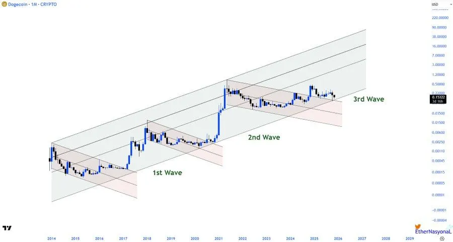 The chart by analyst EᴛʜᴇʀNᴀꜱʏᴏɴᴀL illustrates Dogecoin’s long-term market structure through a series of expanding trend channels, highlighting three major historical waves. DOGE is currently navigating the third wave, but price action remains confined within a tight consolidation zone inside the upper portion of the channel.