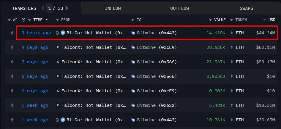 Bitmine has purchased 14,618 ETH worth $44.34 million from BitGo’s hot wallet, Arkham Intelligence on Arkm Explorer confirms. The transfer occurred about three hours ago, according to Arkham’s Ethereum transaction log.