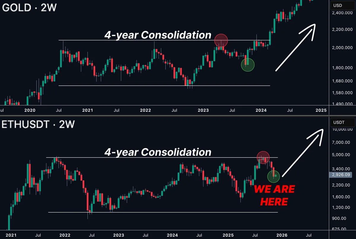 Now, trader Tracer argues that Ethereum is tracking a similar four year consolidation pattern to gold’s recent breakout. In a two week chart comparison, he shows gold breaking above a multi year horizontal range and then using the former ceiling as support before trending higher.