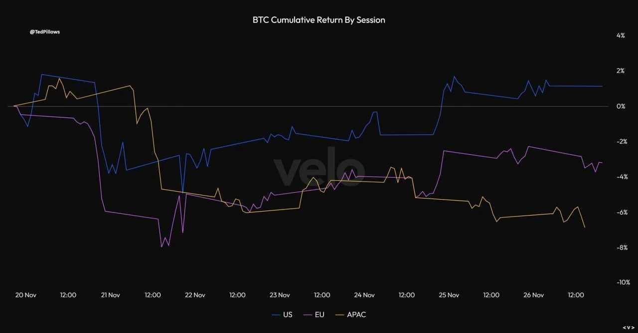Asia continues to show the weakest profile. The yellow APAC line slides soon after Nov. 20 and spends most of the week between roughly minus 5 and minus 7 percent. Ted Pillows, who shared the chart, noted that Asian hours have again been the dominant selling window for Bitcoin this year, while U.S. traders are once more providing net demand.