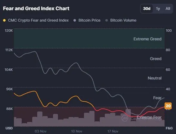 The 30-day chart shows the index sliding from higher levels earlier in November toward the red “extreme fear” band as prices trended lower. Bitcoin’s line on the graphic falls from above 110,000 dollars to below 90,000 dollars over the period, while volume bars remain relatively steady in the background. Together, the curves illustrate how risk appetite has eroded during the pullback.