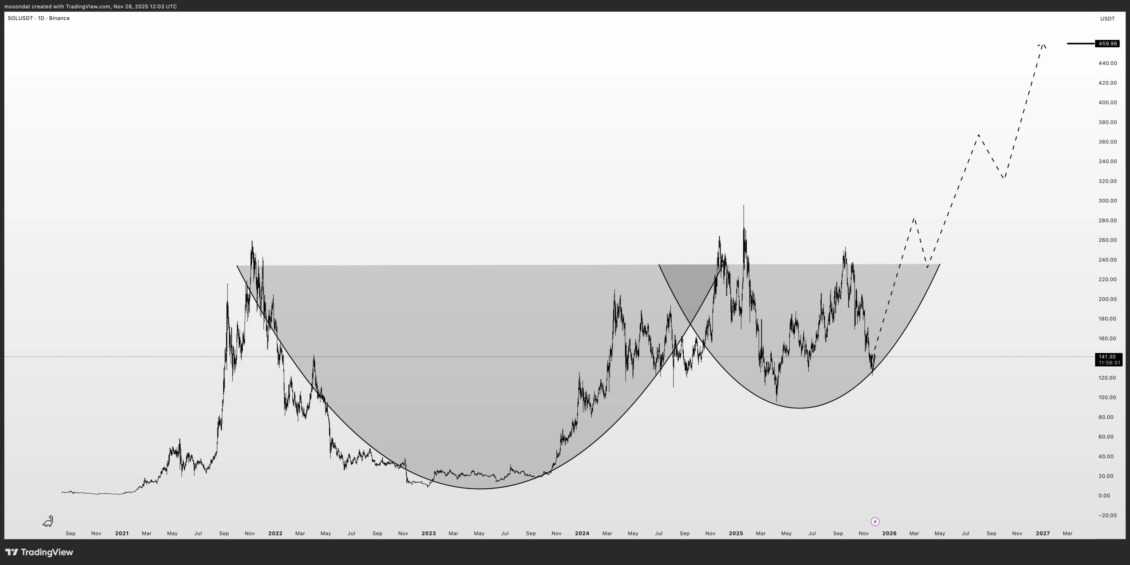 Another analyst moonbag tracks a larger multi-year cup-and-handle structure forming on higher time frames. Price continues to turn upward from the $120 to $135 accumulation area. A reclaim of $160 strengthens momentum toward $200.