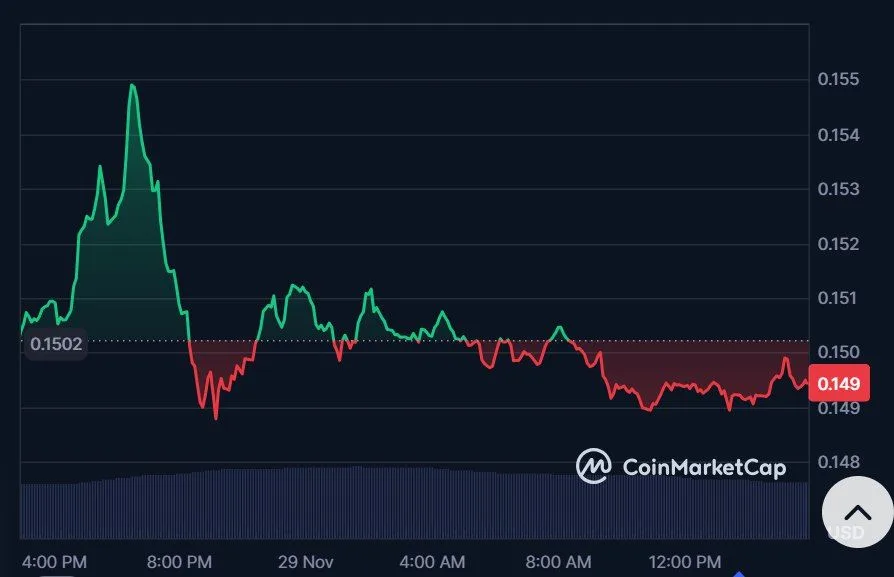 Dogecoin briefly spiked above $0.155 before losing momentum and sliding back toward the $0.150 zone. Since then, the price has moved mostly sideways with mild volatility, showing weak buying pressure.