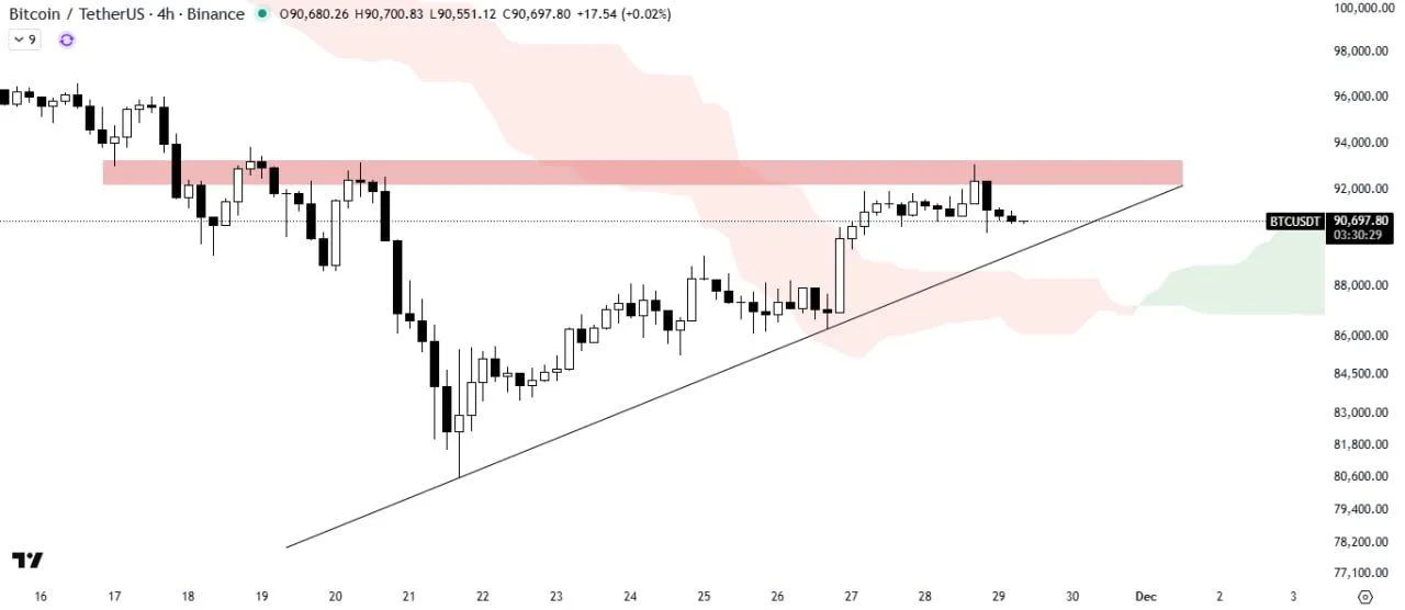Meanwhile, Bitcoin’s BTC/USDT pair is testing a key supply zone while trading inside an ascending triangle on the four-hour chart, according to analyst CryptOpus. Price recently pushed into a horizontal resistance band just below 92,000 USDT, but candles show rejection from that area, keeping buyers capped for now.