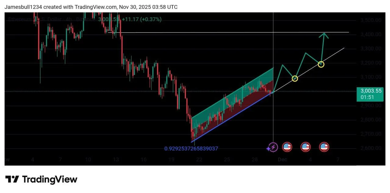 Ethereum (ETH) is tracing a textbook bullish structure, chart analyst James Bull said on X. His 4-hour TradingView chart shows ETH breaking out of a downtrend, pulling back to the former resistance line and holding it as support near $3,000.