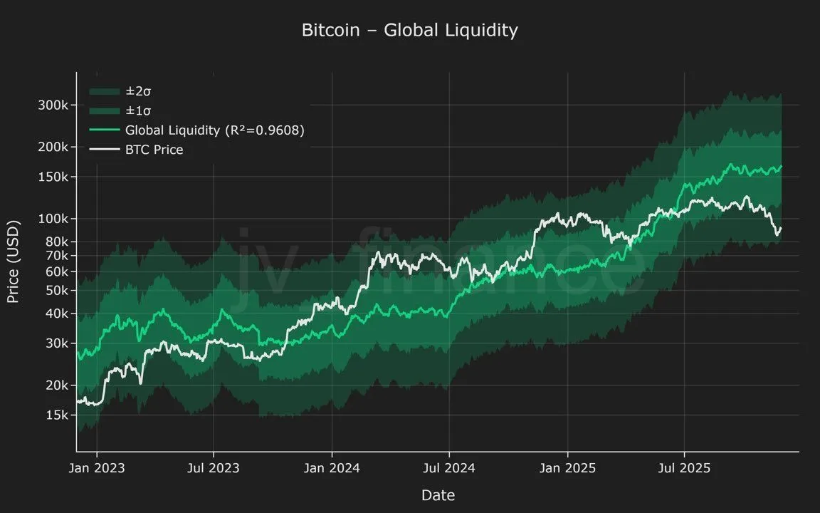 The chart plots Bitcoin’s price as a white line against a green liquidity regression band. The band includes one- and two-standard-deviation zones, with a central line labeled “Global Liquidity.” As the model trends higher through 2023–2025, the fair-value line climbs above $150,000 while the spot price lags in the lower half of the range.
