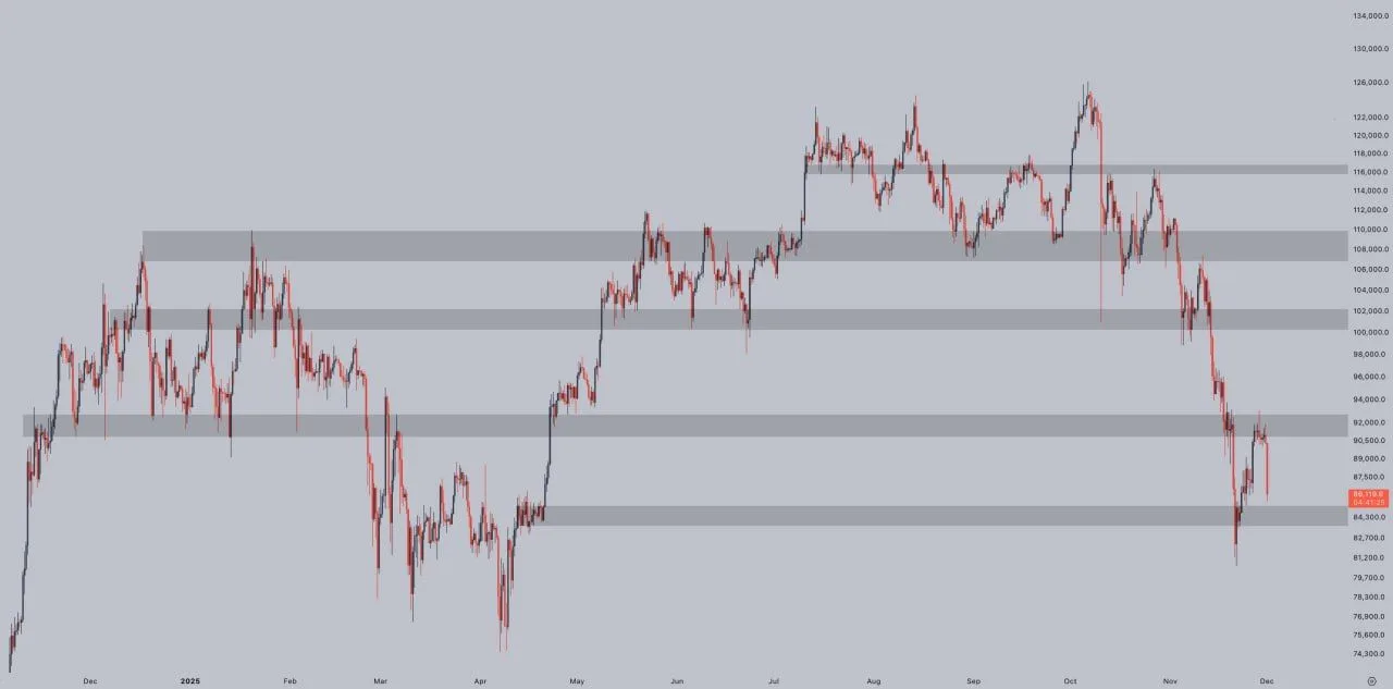 The chart he shared maps a series of gray support and resistance bands across the recent rally and subsequent sell-off. Price first bounced from a demand zone in the mid-$80,000s, then pushed into a resistance block around the low-$90,000 region, where the move failed. The rejection left Bitcoin trading back inside the same broader range, with the current candle hovering above the lower gray band.
