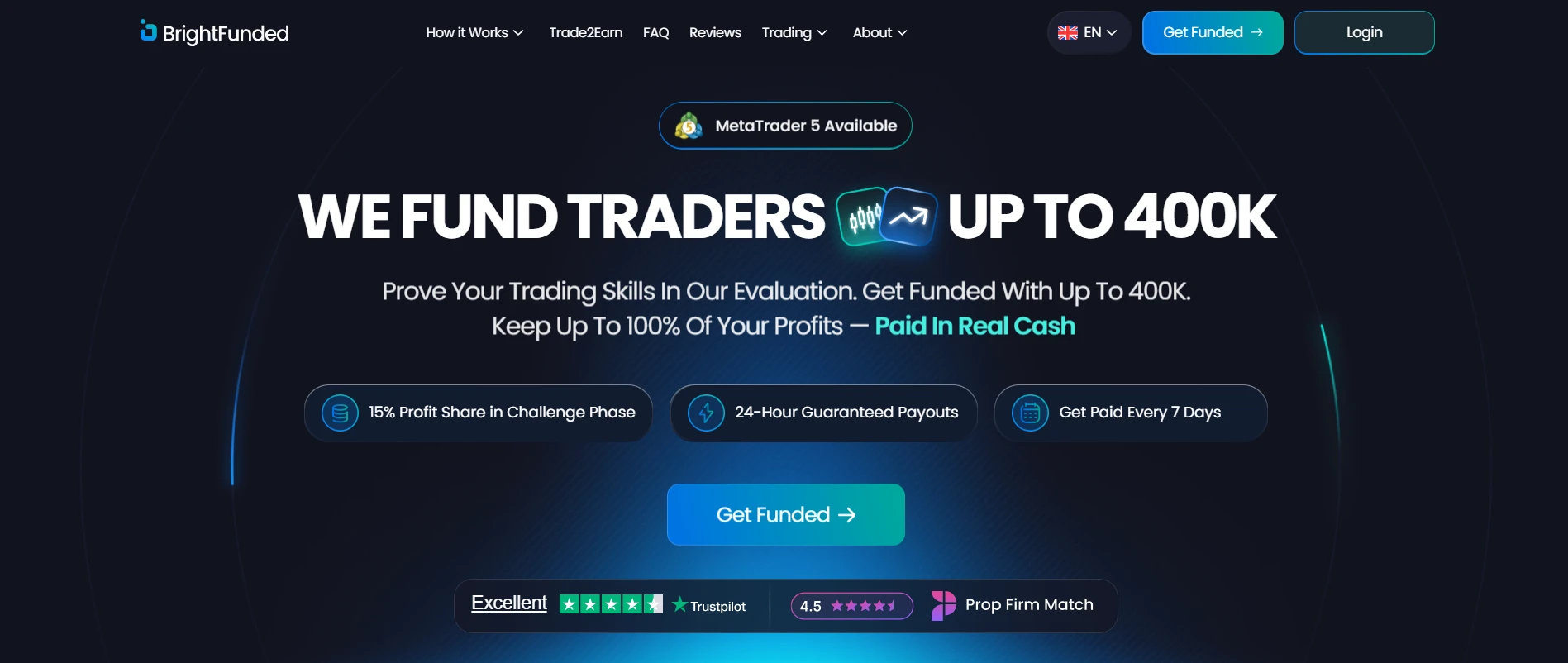 Launched in 2023 and headquartered in Dubai, BrightFunded has rapidly gained traction with a 95/100 overall score from industry reviewers. The firm offers 2-step evaluations with no time limits, profit splits reaching 100% through scaling, and the innovative Trade2Earn loyalty program that rewards trading activity regardless of outcome.