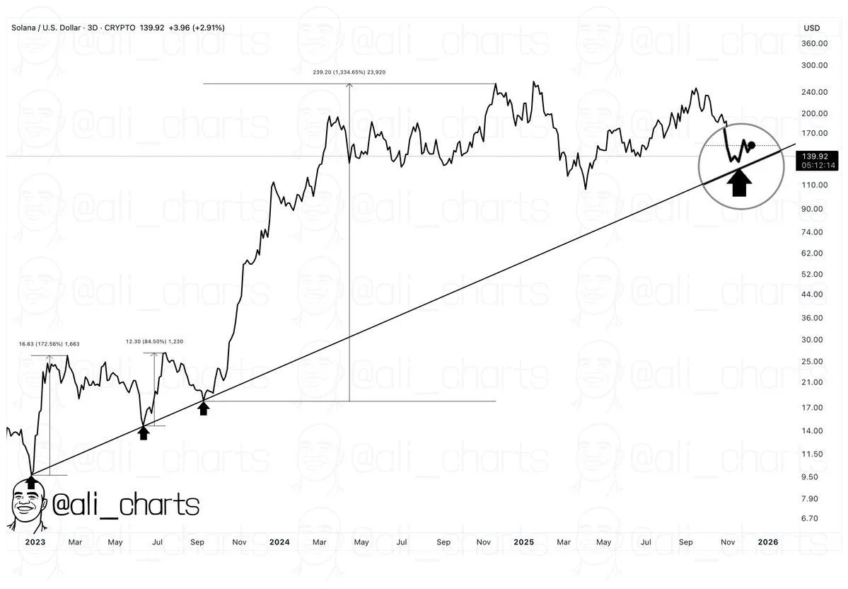 Analyst Ali Martinez noted that Solana continues to respect a long-term ascending trendline that has held since early 2023. Each major retest produced strong rebounds, including moves from $16, $12, and more recently from the $120 area. The latest decline again met buyers along this line, reinforcing its importance.