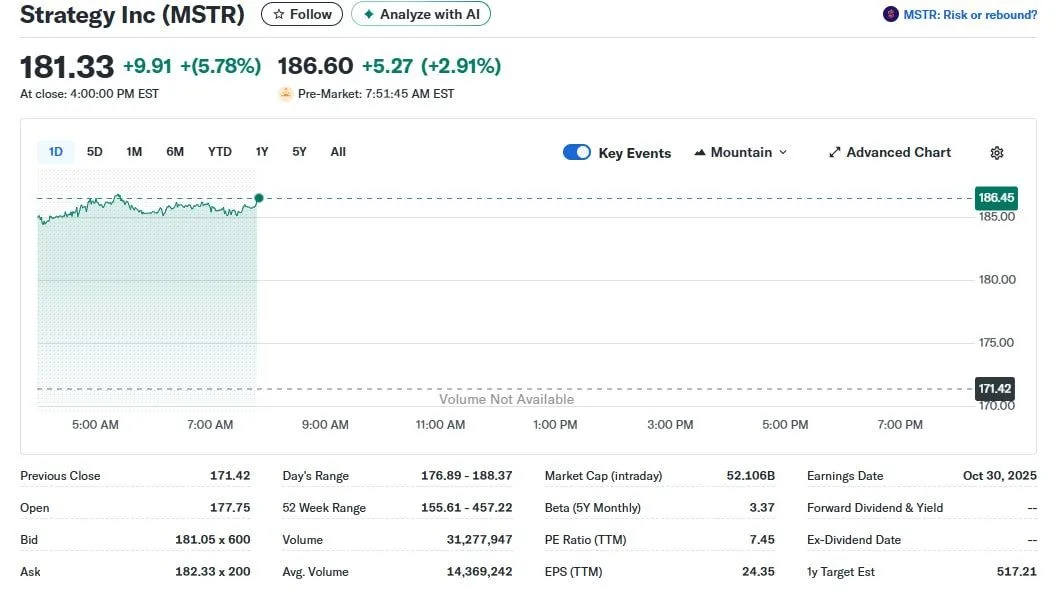 Meanwhile, an options trader says Strategy’s stock now shows a risk-reward profile that leans to the upside after a steep pullback. The shares have dropped more than 60 percent from highs in the mid-400s earlier this year and recently returned to the 150–160 dollar area that acted as a demand zone several times in 2024. Last week, price bounced from that region and pushed back toward 181 dollars while Bitcoin traded steady above 90,000 dollars.
